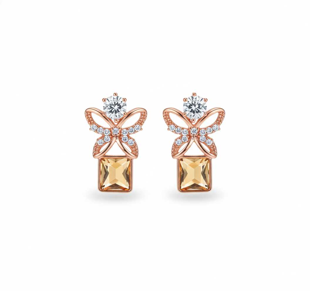 The Gift Bow Glow Drops feature a charming bow design adorned with shimmering crystals, paired with a soft amber-toned square drop. These earrings bring a festive yet elegant vibe, perfect for parties, date nights, and special celebrations.