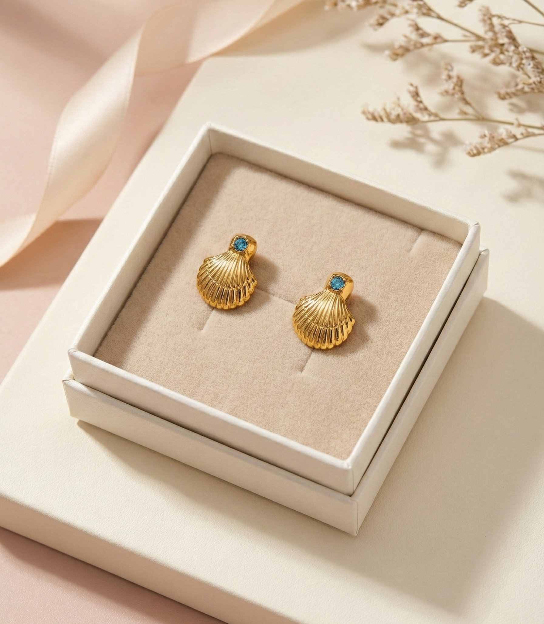 Chic shell-inspired stud earrings with a delicate blue stone accent, finished in a rich gold tone. These anti-tarnish earrings bring a subtle statement vibeβperfect for brunches, parties, and elegant everyday looks. Minimal, classy, and effortlessly stylish.