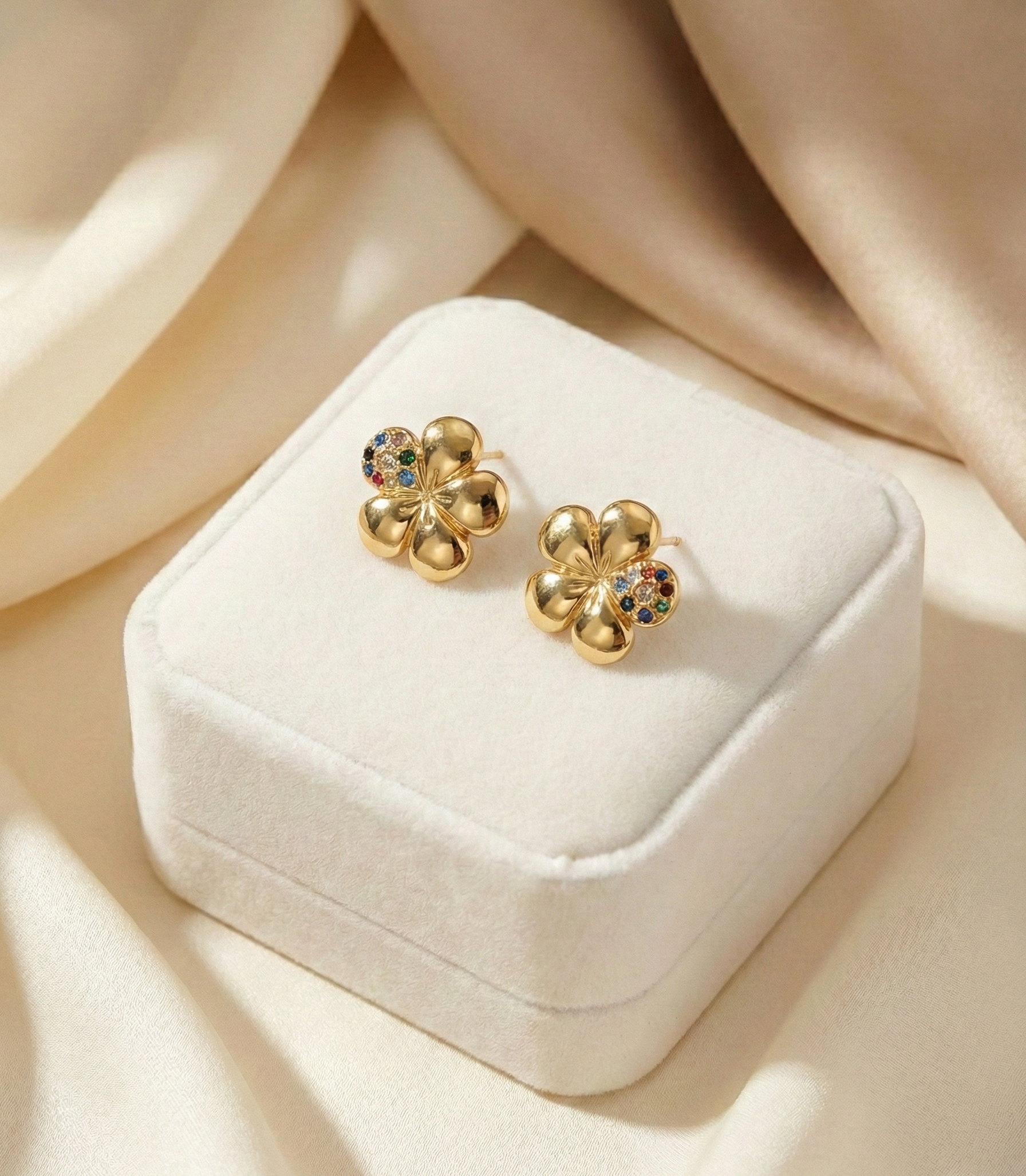 Delicate gold-toned floral studs inspired by Korean minimal aesthetics, featuring subtle multicolour stone detailing. Crafted with an anti-tarnish finish for long-lasting shine, perfect for everyday wear and effortless styling. β¨