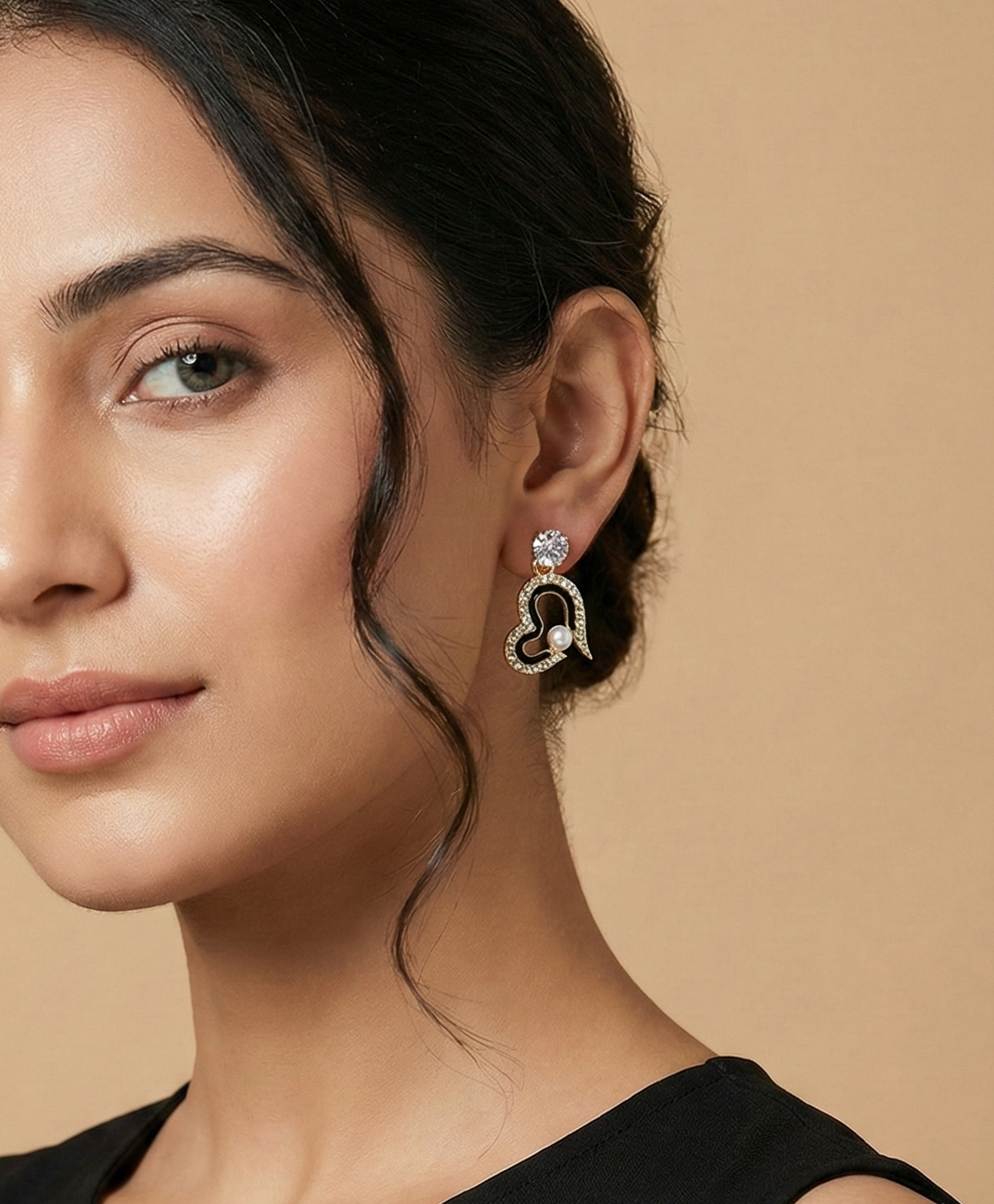 The Midnight Heart Pearl Drops feature a stylish heart silhouette outlined in black and gold tones, adorned with shimmering crystals and finished with a soft pearl centre. Topped with a brilliant crystal stud, these earrings add a perfect balance of romance and elegance.