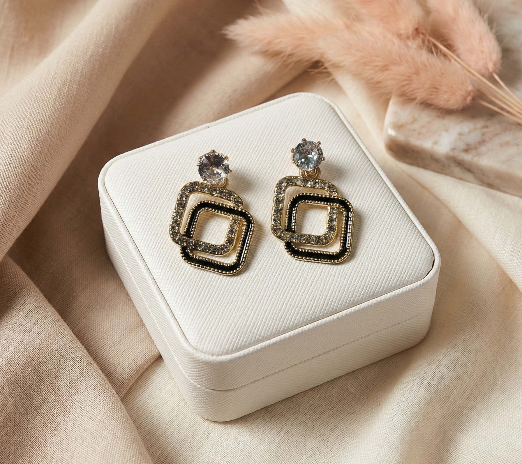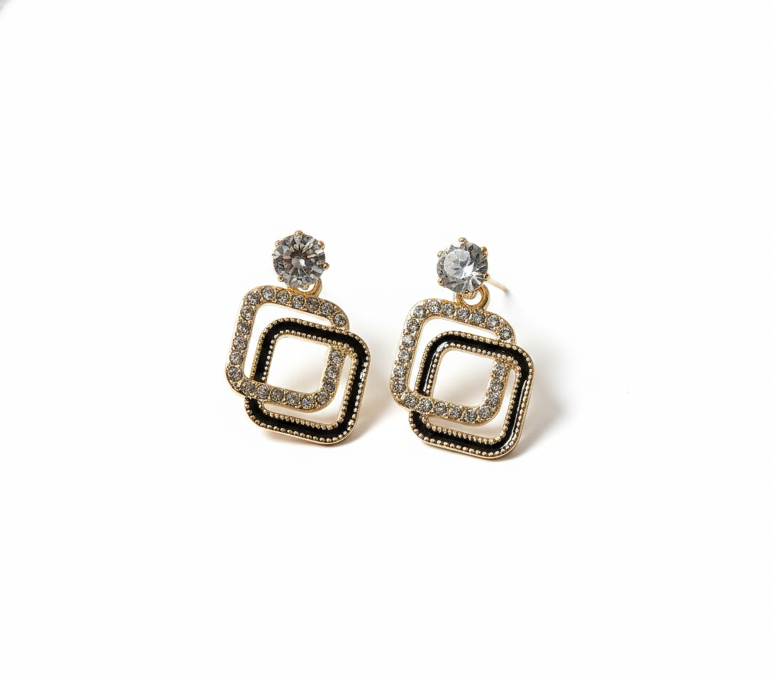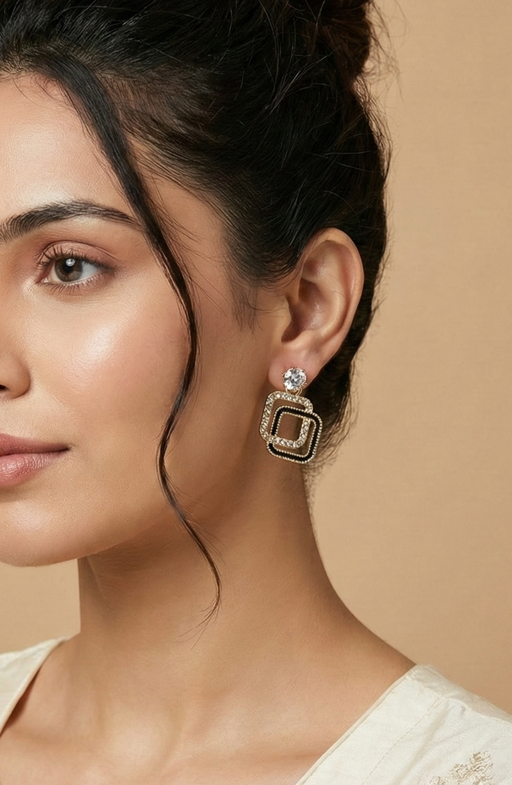 The Midnight Square Sparkle Drops feature a striking geometric design with layered square frames in gold and black tones, highlighted by brilliant crystal detailing. These earrings bring a perfect balance of elegance and edge.
