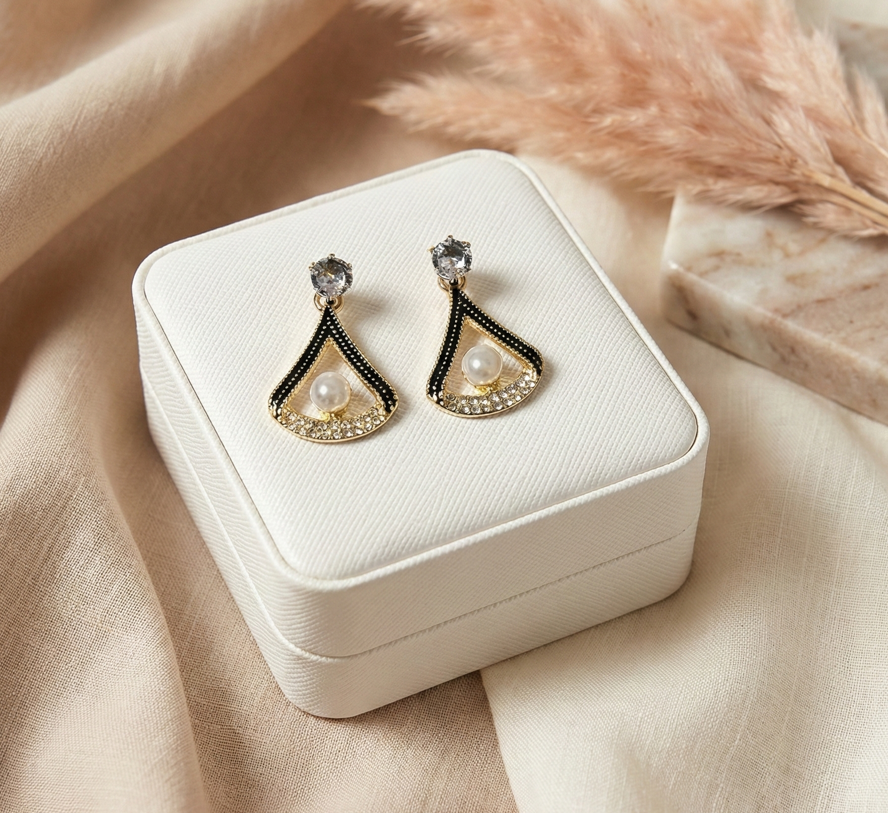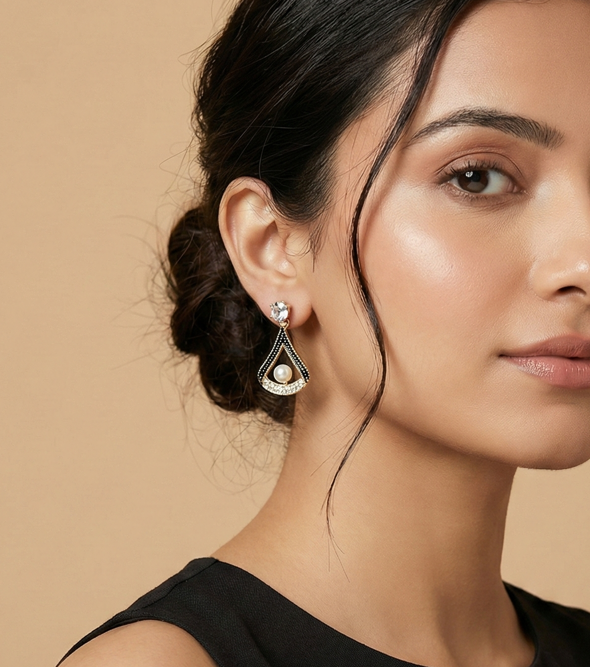 The Noir Pearl Frame Drops feature a stylish black-accented teardrop frame with crystal detailing and a soft pearl centre. Finished with a sparkling stud top, these earrings bring refined glamour with a contemporary edge.