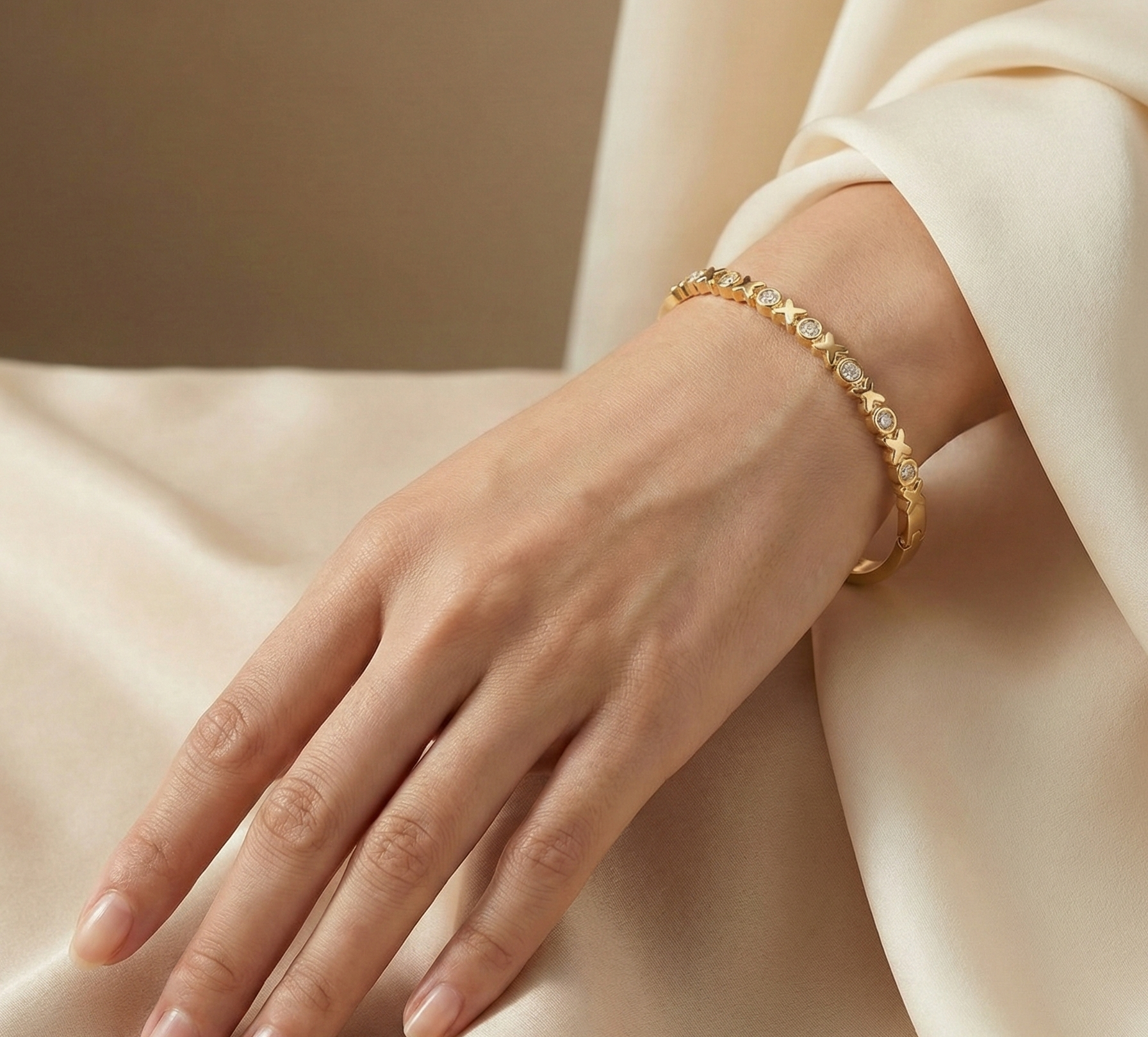 The Regal Bloom Diamond Bangle is a perfect blend of elegance and structure. Crafted in a polished gold-tone finish, it features a refined pattern accented with delicate crystal detailing, creating a graceful rhythm of sparkle and design.