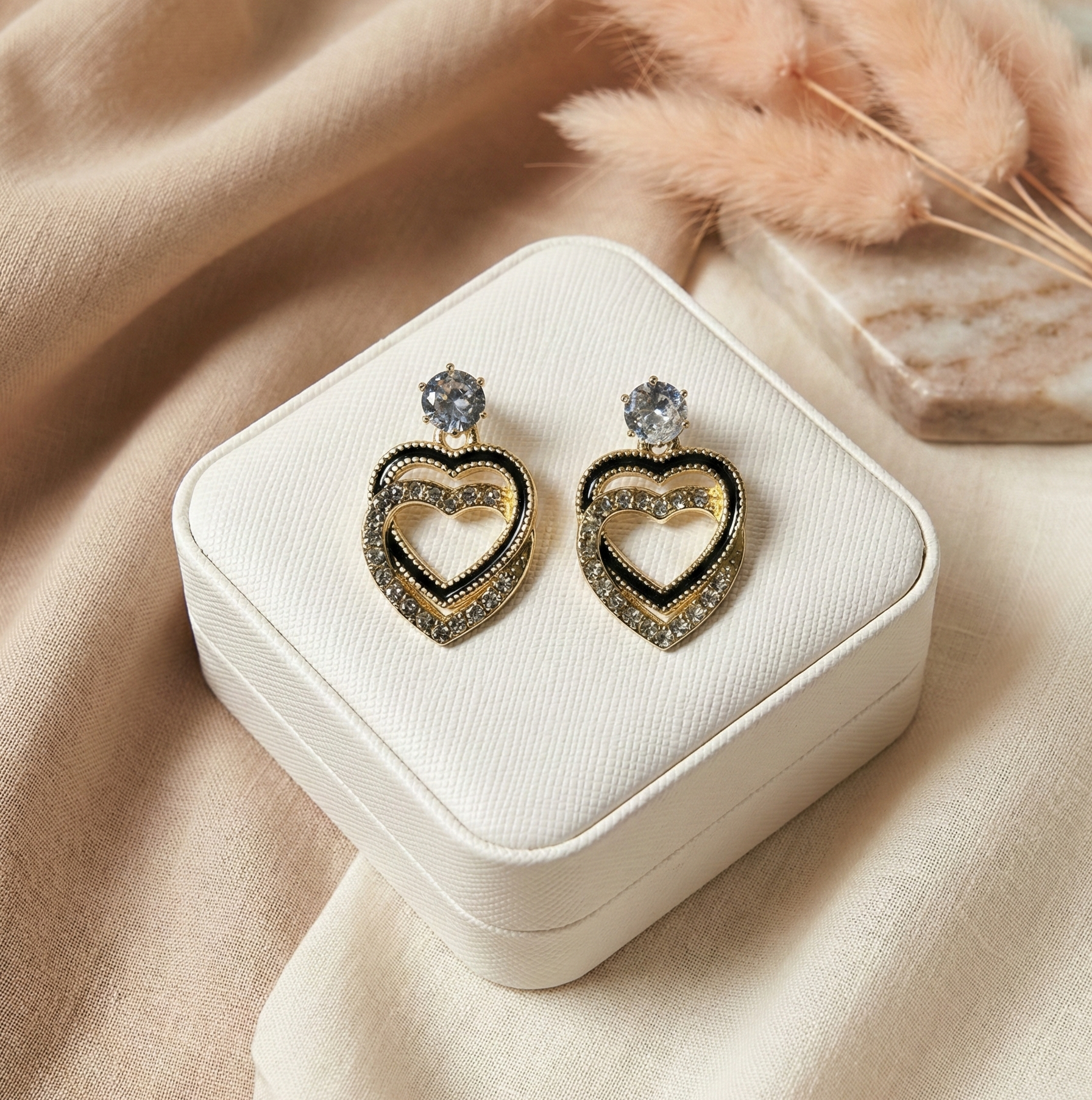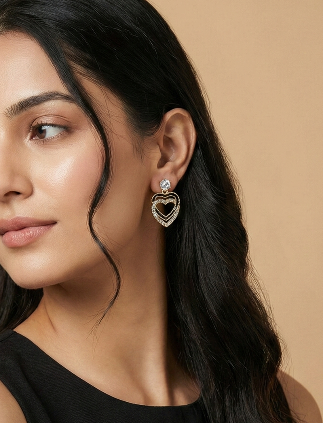 The Royal Heart Sparkle Drops feature layered heart frames in gold and black tones, adorned with shimmering crystals and topped with a brilliant stud. These earrings add a rich, glamorous charm to your look.