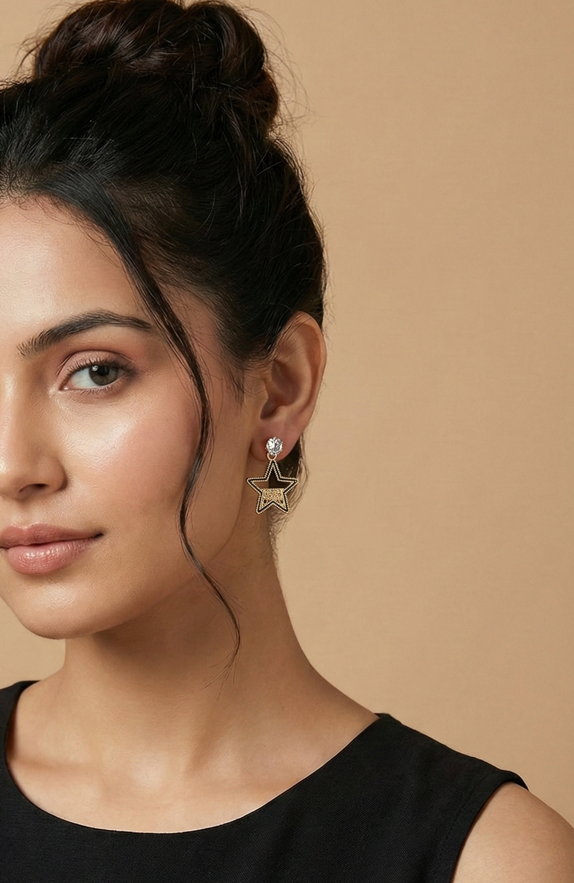 The Starlight Sparkle Drops feature a chic star-shaped design highlighted with crystal detailing and a brilliant stud top. Finished in gold and black accents, these earrings add a fun yet elegant shine to your look.