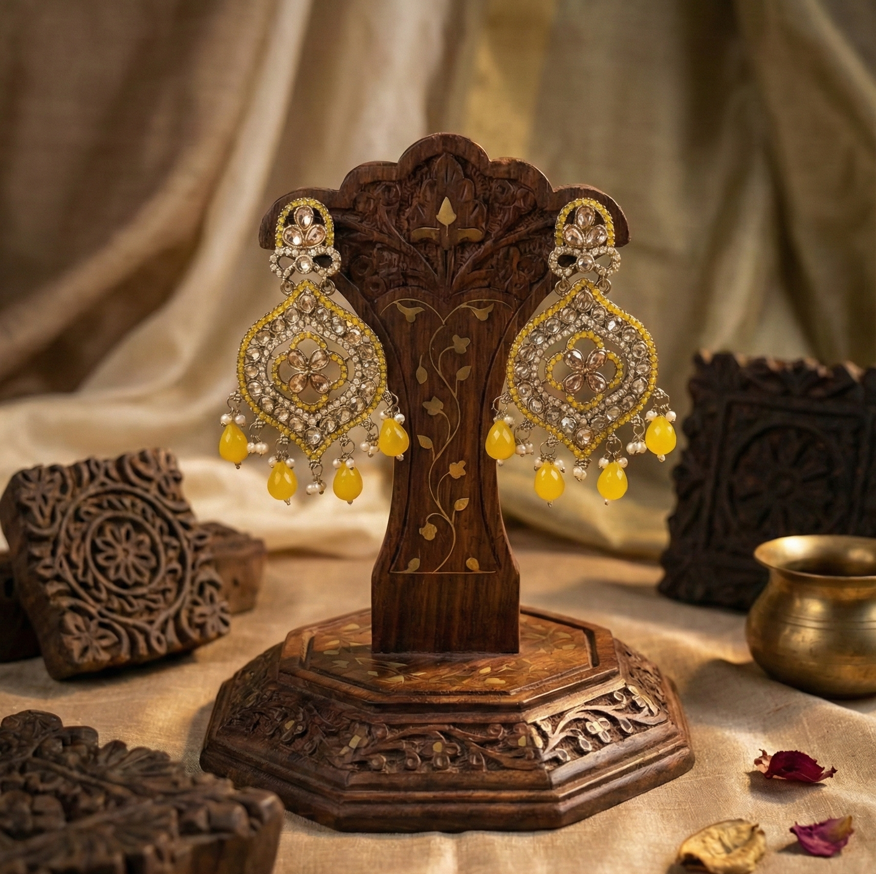 The Sunehri Noor Chandbalis are a radiant blend of traditional craftsmanship and vibrant yellow stone detailing. Adorned with intricate gold patterns, crystal accents, and delicate hanging drops, these earrings bring warmth, richness, and celebration to your look.