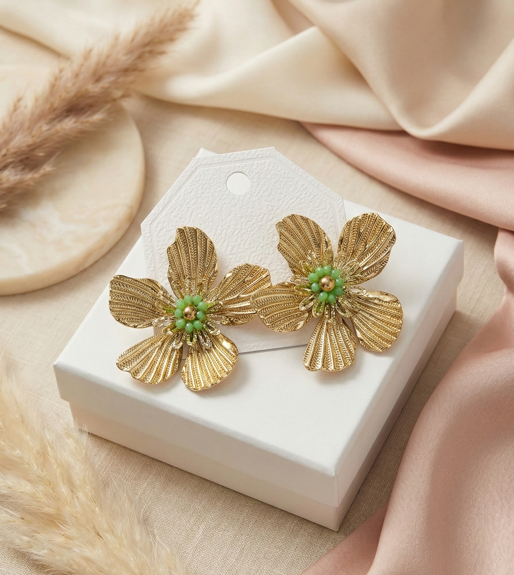 Striking and nature-inspired, the Verdant Bloom Gold Statement Studs feature intricately textured gold-tone petals arranged in a bold floral silhouette. At the heart of each bloom sits a cluster of fresh green beads, adding a vibrant pop of color and depth.