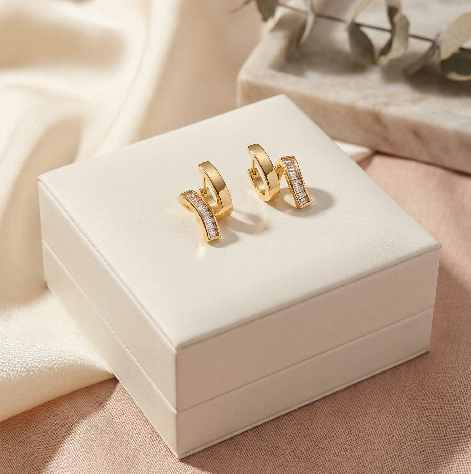 Sleek gold-toned mini hoops highlighted with shimmering baguette-cut crystals for a clean, modern look. Minimal yet classy, these earrings come with an anti-tarnish finish, making them perfect for daily wear, office looks, or subtle party styling. Elegant, effortless, and timeless. β¨